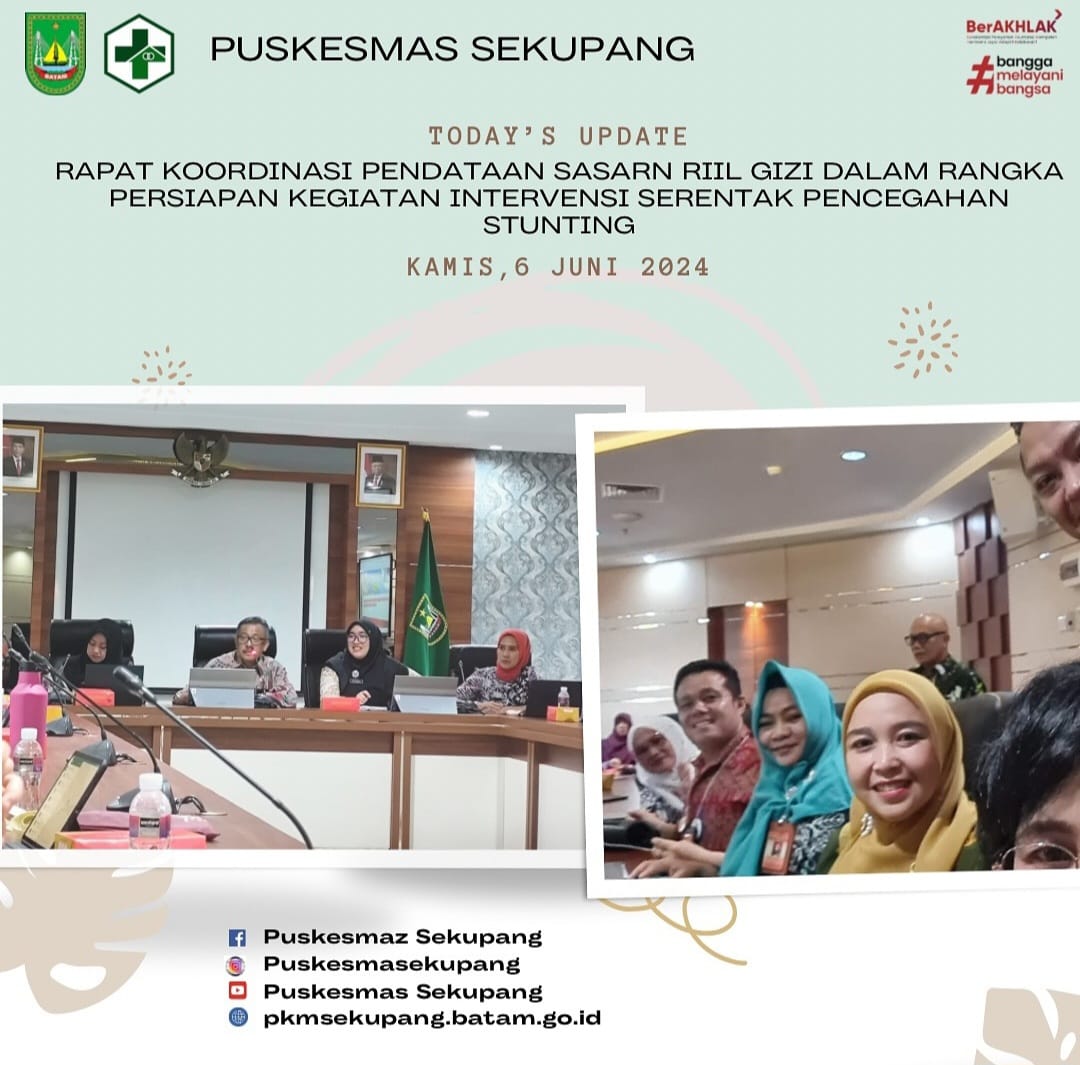 Pada tanggal 6 Juni 2024, Kepala Puskesmas Sekupang, Ibu Indriani Ningsih, SKL turut hadir dalam rapat koordinasi Pendataan Sasaran Riil Gizi dalam Rangka Persiapan Kegiatan Intervensi Serentak Pencegahan Stunting. Rapat Koordinasi ini dihadiri langsung oleh Sekretaris Daerah Kota Batam, Bapak Jefridin, M.Pd, Kepala Dinas terkait, Camat, Lurah, serta Seluruh Kepala Puskesmas se Kota Batam.