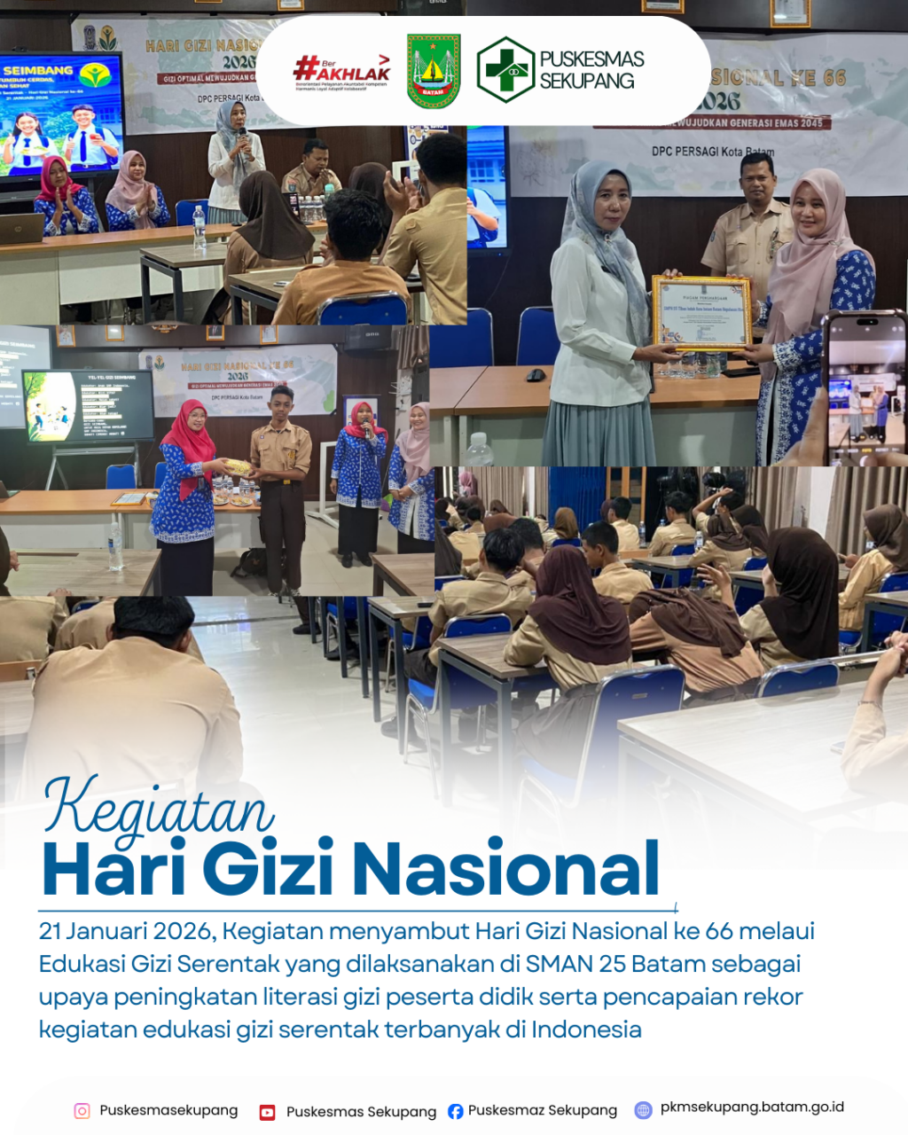 Tema dan slogan tersebut menekankan pentingnya pemanfaatan pangan lokal sebagai sumber gizi seimbang serta mendorong perubahan perilaku masyarakat untuk memulai pola hidup sehat dari pilihan makanan sehari-hari. Dalam rangkaian peringatan Hari Gizi Nasional Ke 66, Nutrisionis Puskesmas Sekupang Ibu Novi Mariastuti, AMG melakukan siaran live di RRI Batam Pro bersama ketua DPC Persagi Kota Batam ibu Dewi Cahaya Rahayu, S,KM.,MM membahas tentang Gizi Optimal untuk Generasi Emas 2045. Rangkaian kegiatan selanjutnya adalah Edukasi Gizi Serentak yang dilaksanakan di 1846 sekolah di 36 Propinsi se Indonesia, salahsatunya di SMPN 25 Kota Batam serta memperoleh Rekor Muri sebagai Edukasi Serentak di Sekolah terbanyak.