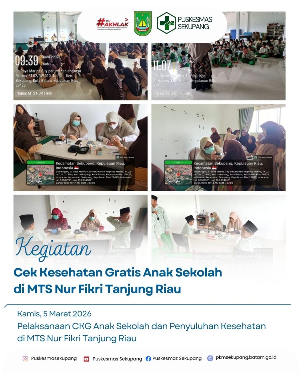Kamis dan Jumat 4 & 5 Maret 2026 Tim Puskesmas Skeupang melaksanakan Cek Kesehatan Gratis di MTS Nur Fikri yang dilaksanakan selama 2 hari, sebanyak 180 siswa dan siswi mendapatkan pelayanan cek kesehatan gratis.