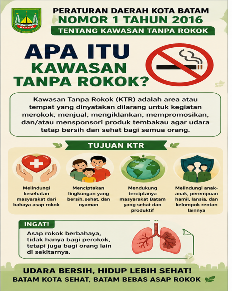 Dalam rangka melindungi masyarakat dari bahaya asap rokok, Pemerintah Kota Batam telah menetapkan Peraturan Daerah Kota Batam Nomor 1 Tahun...