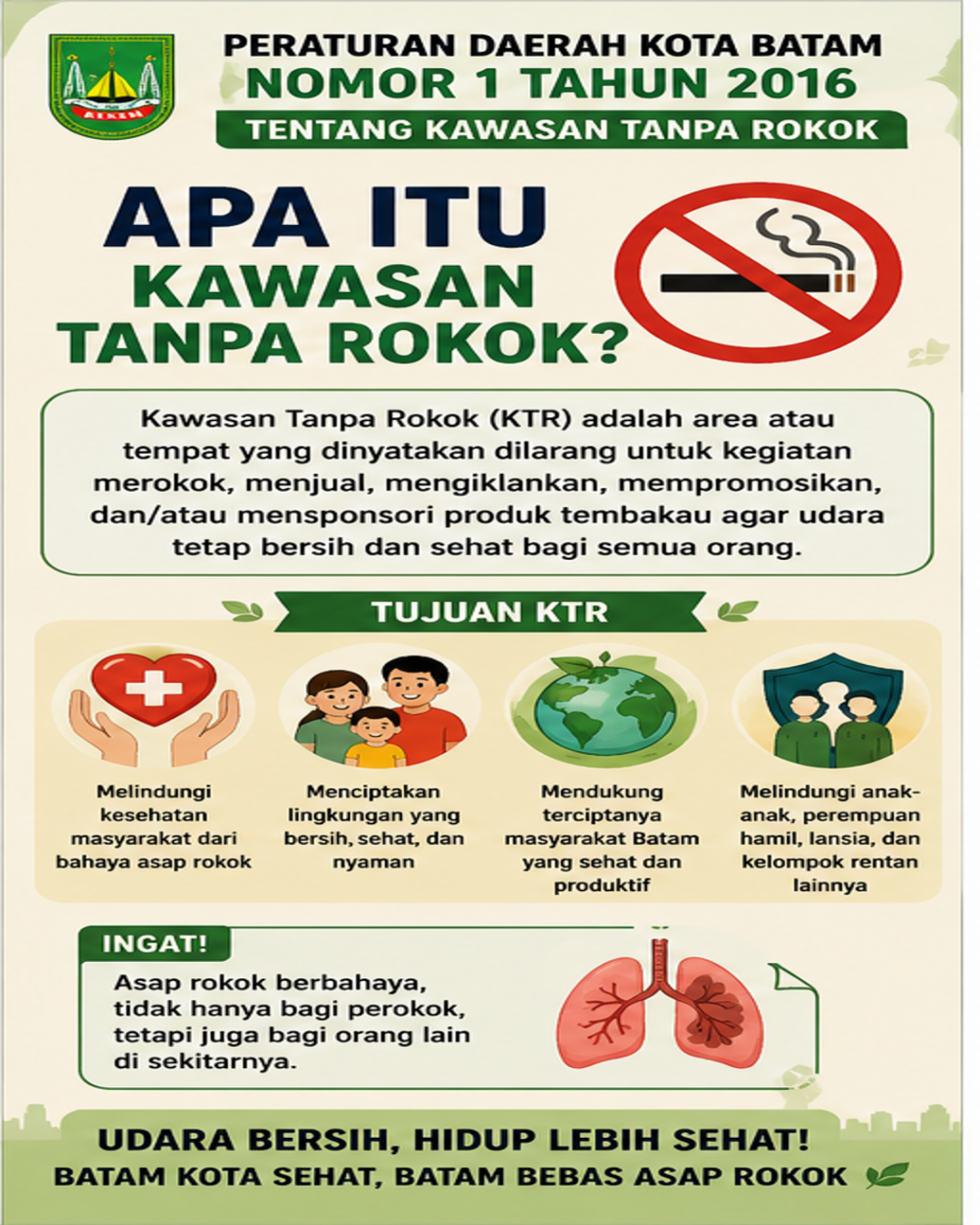 Dalam rangka melindungi masyarakat dari bahaya asap rokok, Pemerintah Kota Batam telah menetapkan Peraturan Daerah Kota Batam Nomor 1 Tahun 2016 tentang Kawasan Tanpa Rokok (KTR). Kebijakan ini menjadi langkah penting dalam menciptakan lingkungan yang sehat, aman, dan nyaman bagi seluruh masyarakat.